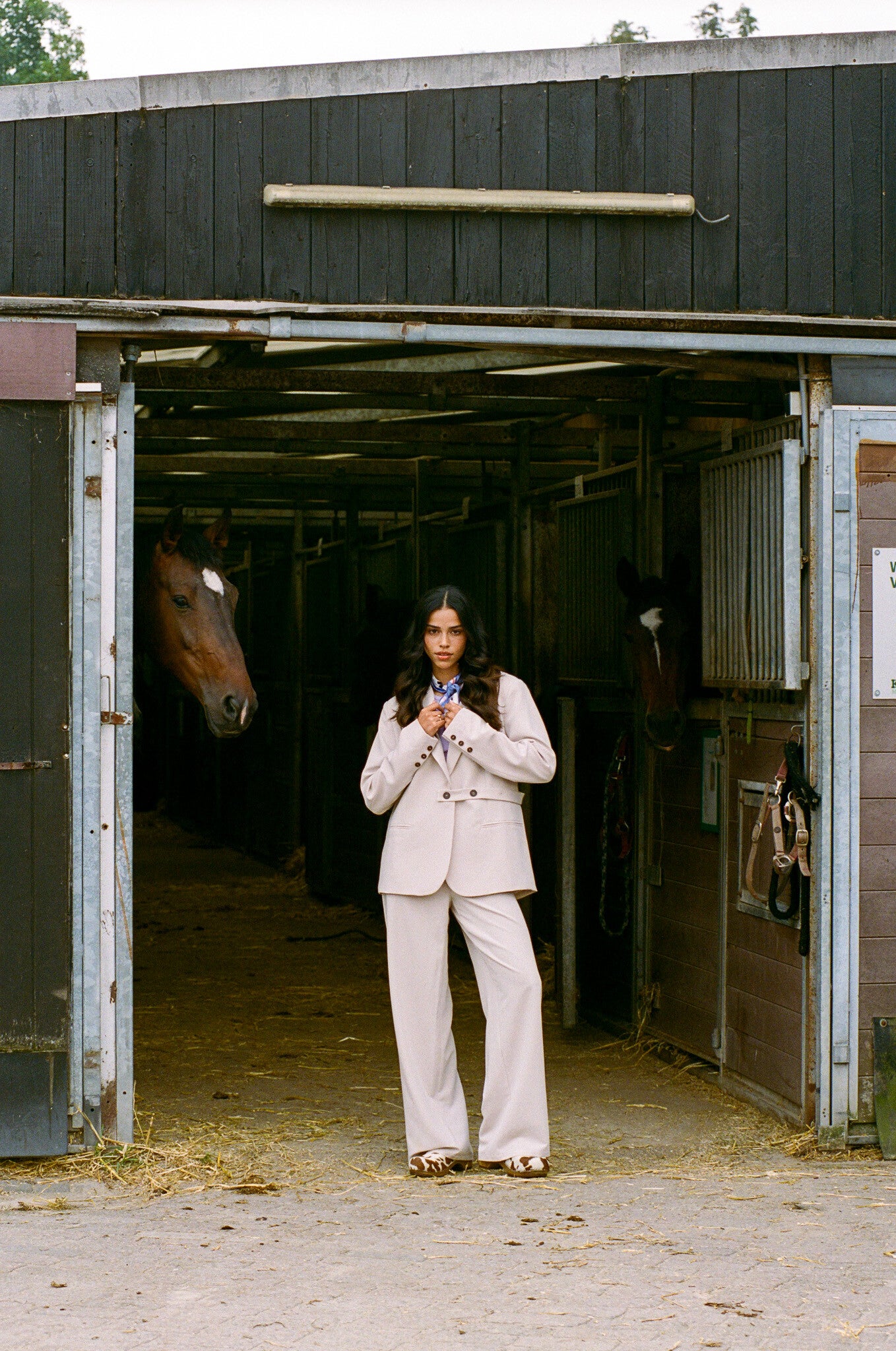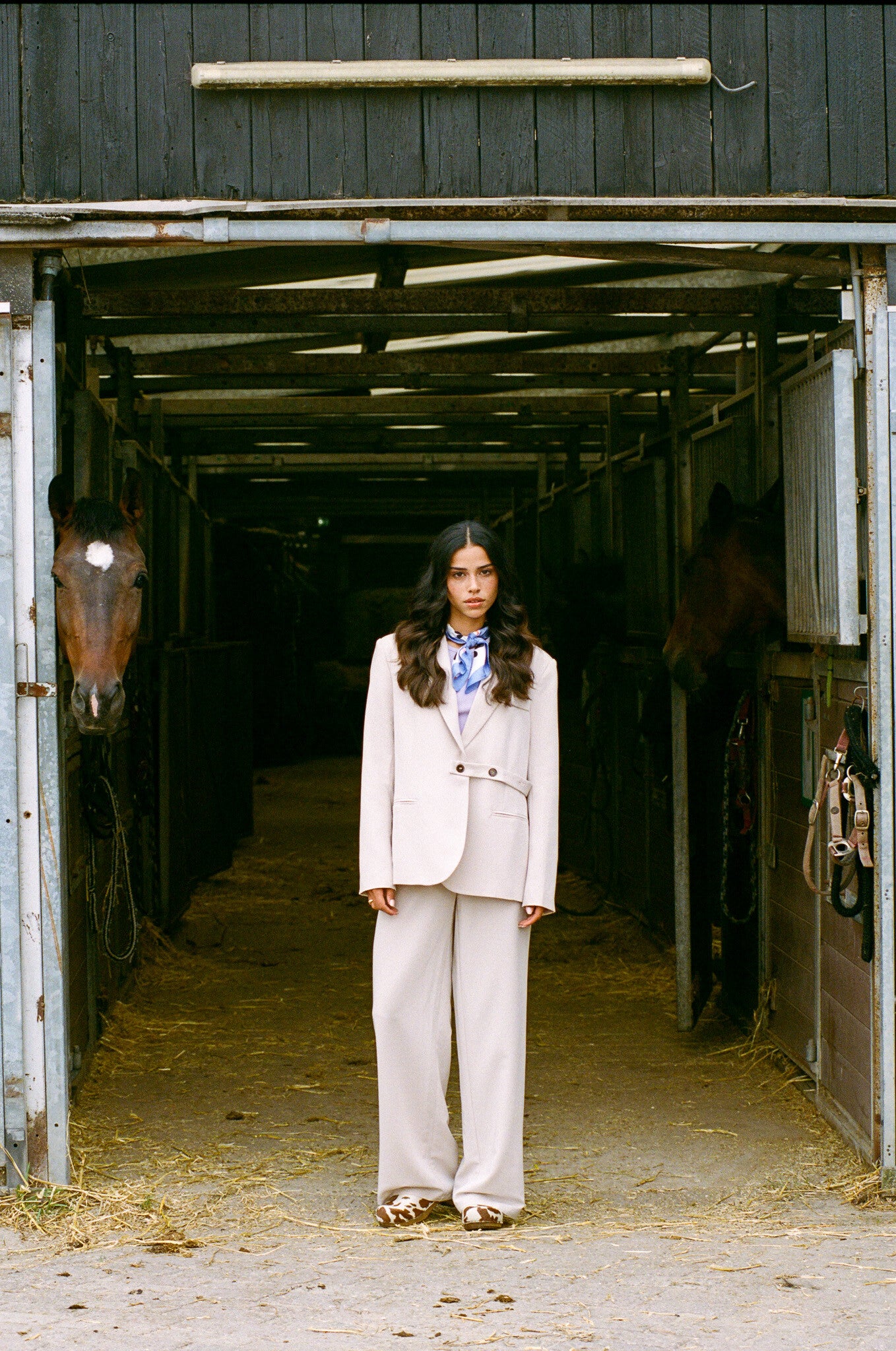 Blazer Merel van FLURESK in een zand kleur. Mooi te dragen als set met bijpassende broek Liore.