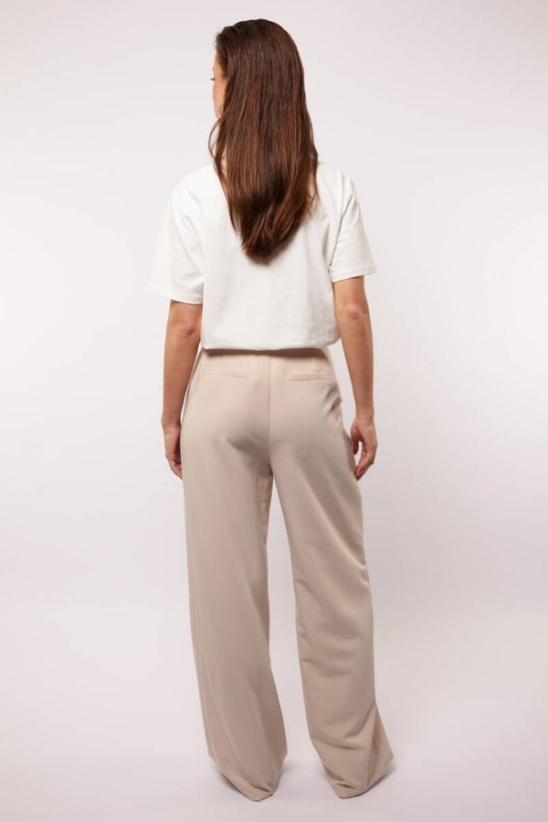 Broek Liore in zand kleur van FLURESK. Hoog in de taille en een wijde pijp. Mooi te dragen als set samen met de bijpassende blazer Merel.