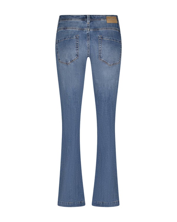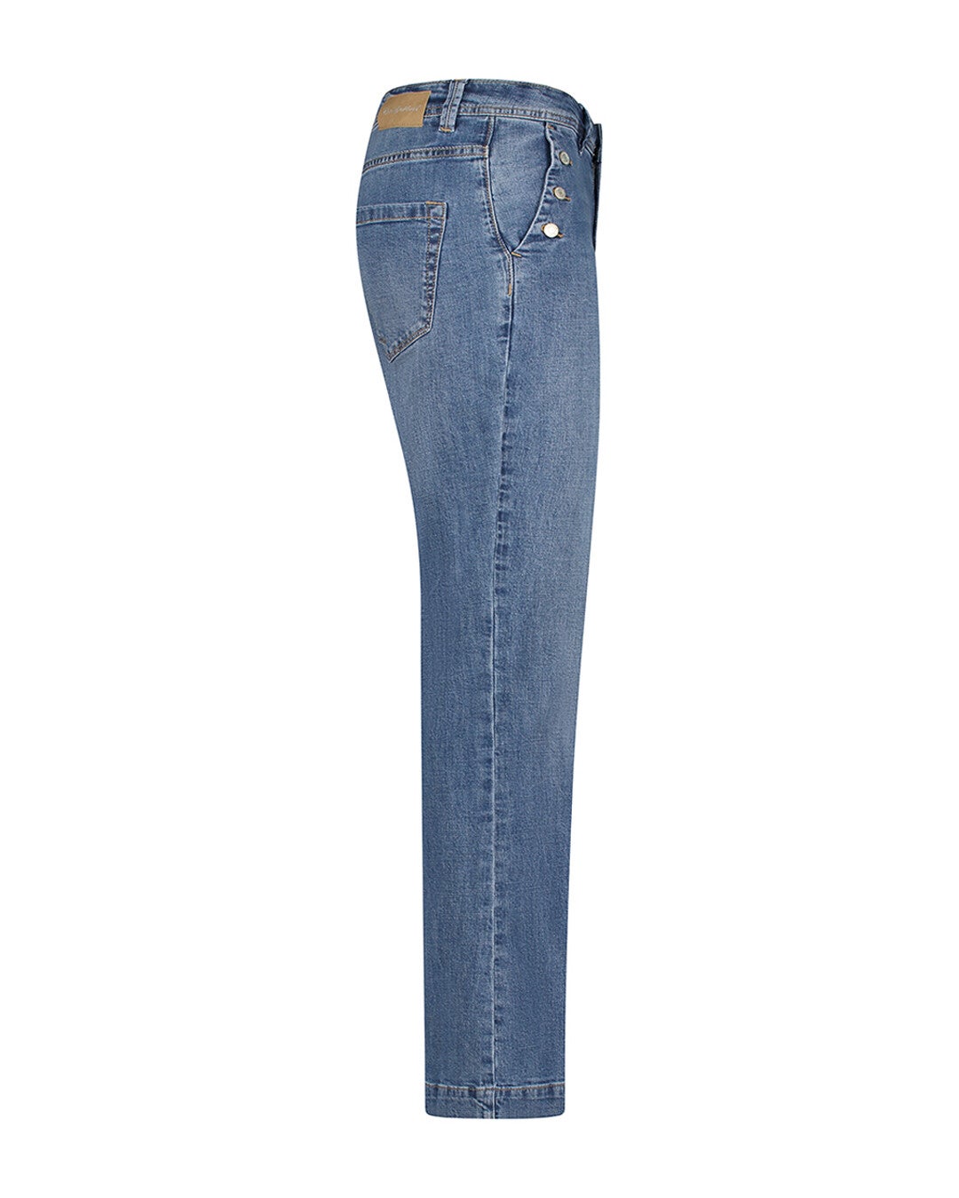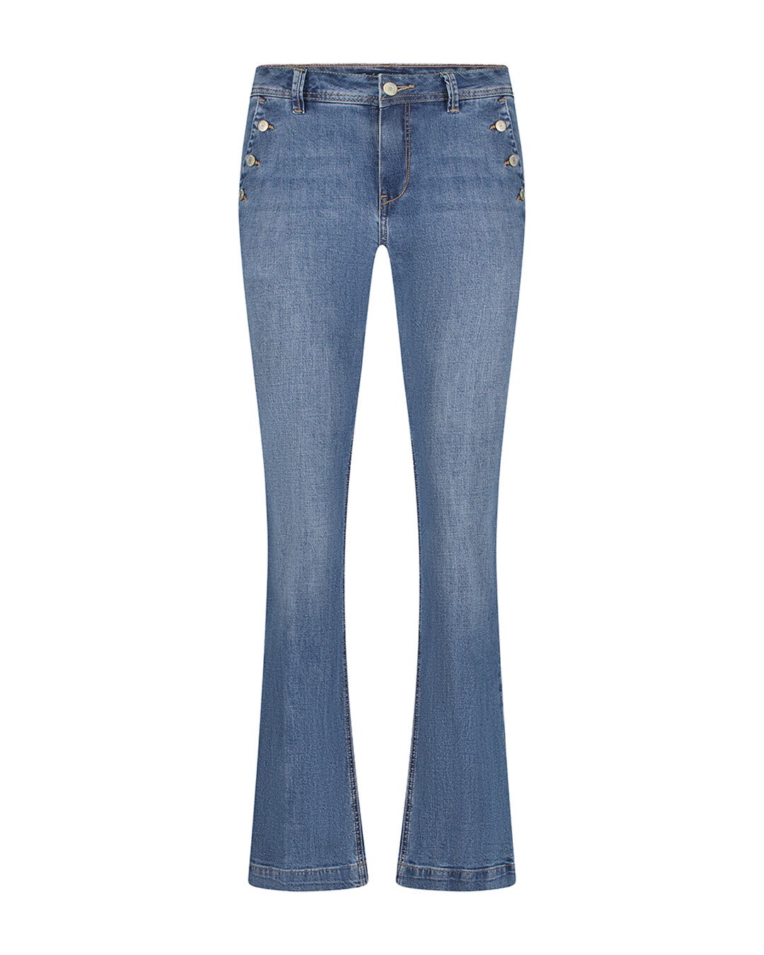 Red Button Denim Bibette in de wassing Stone Used met uitlopende pijp. Heeft knopen op de zakken als leuke detail.