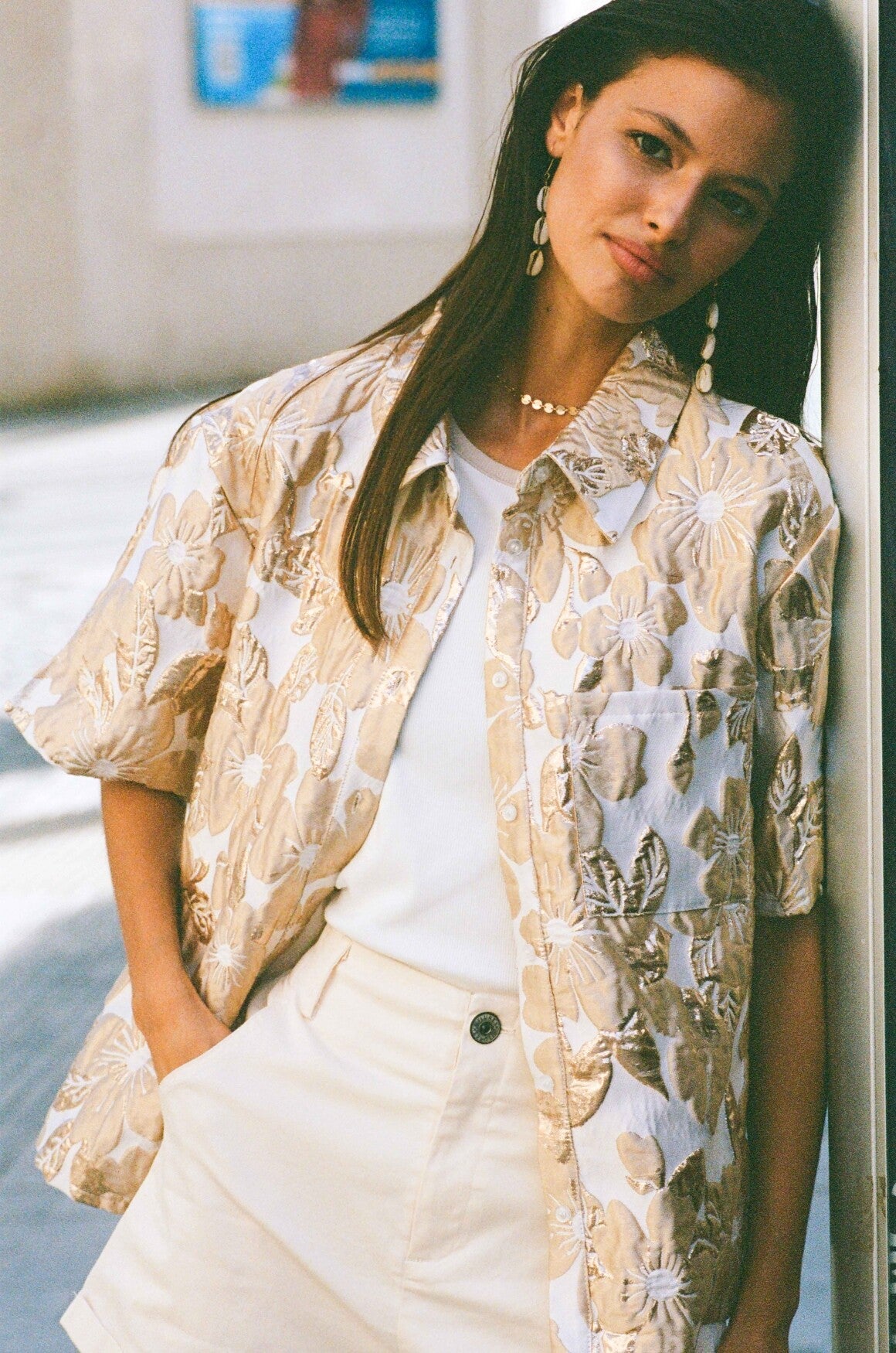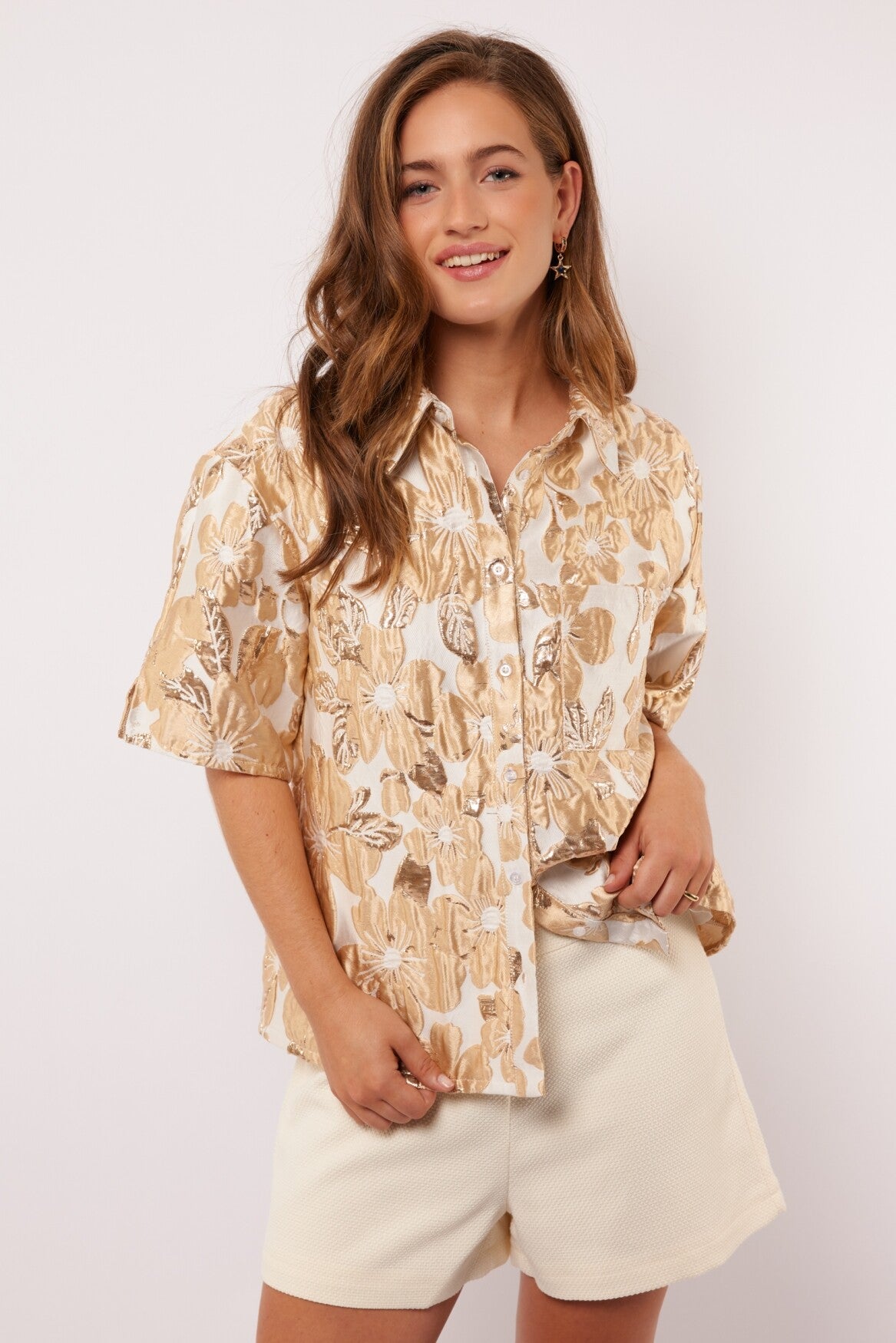 Fluresk blouse Noell in offwhite met een licht bruine bloemenprint met lurex. Heeft korte mouwen en knoopjes aan de voorkant.