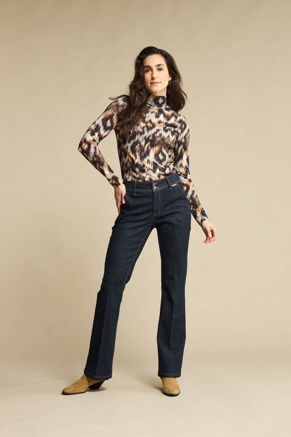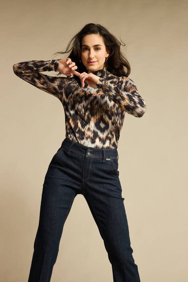 Red Button top Rolinde met etnische print in mid brown. Hele fijne top van comfortabel materiaal met opstaand boord.