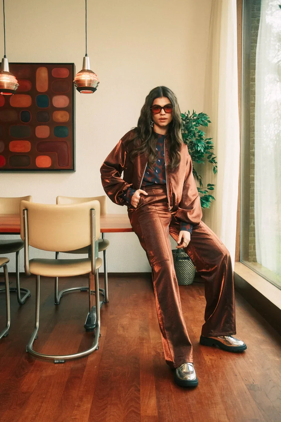 FLURESK jacket Thirza in de kleur rum raisan. Bomberjack model van glanzende metallic stof. Heeft een rits aan de voorkant.