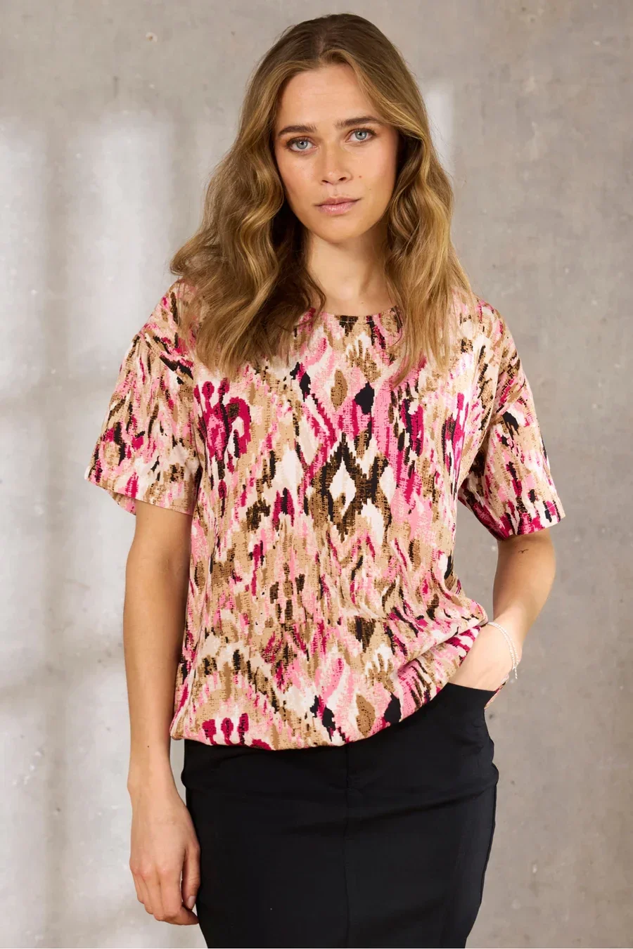 ZE-ZE top Relly in roze/bruine print. De top heeft een ronde hals en korte mouw. Gemaakt van 100% viscose.