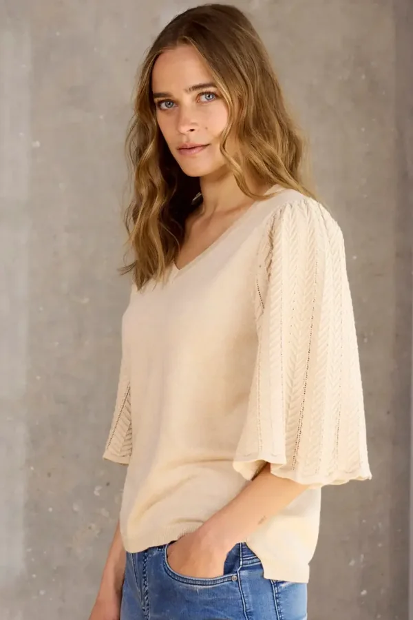 ZE-ZE Top Dambis in het beige. De top heeft een V-hals, en uitlopende 3/4 mouwtjes met motief.
